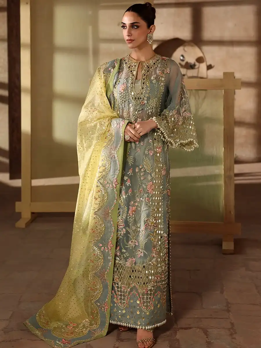 Front aur back daman par sequinned aur embroidered detailing.