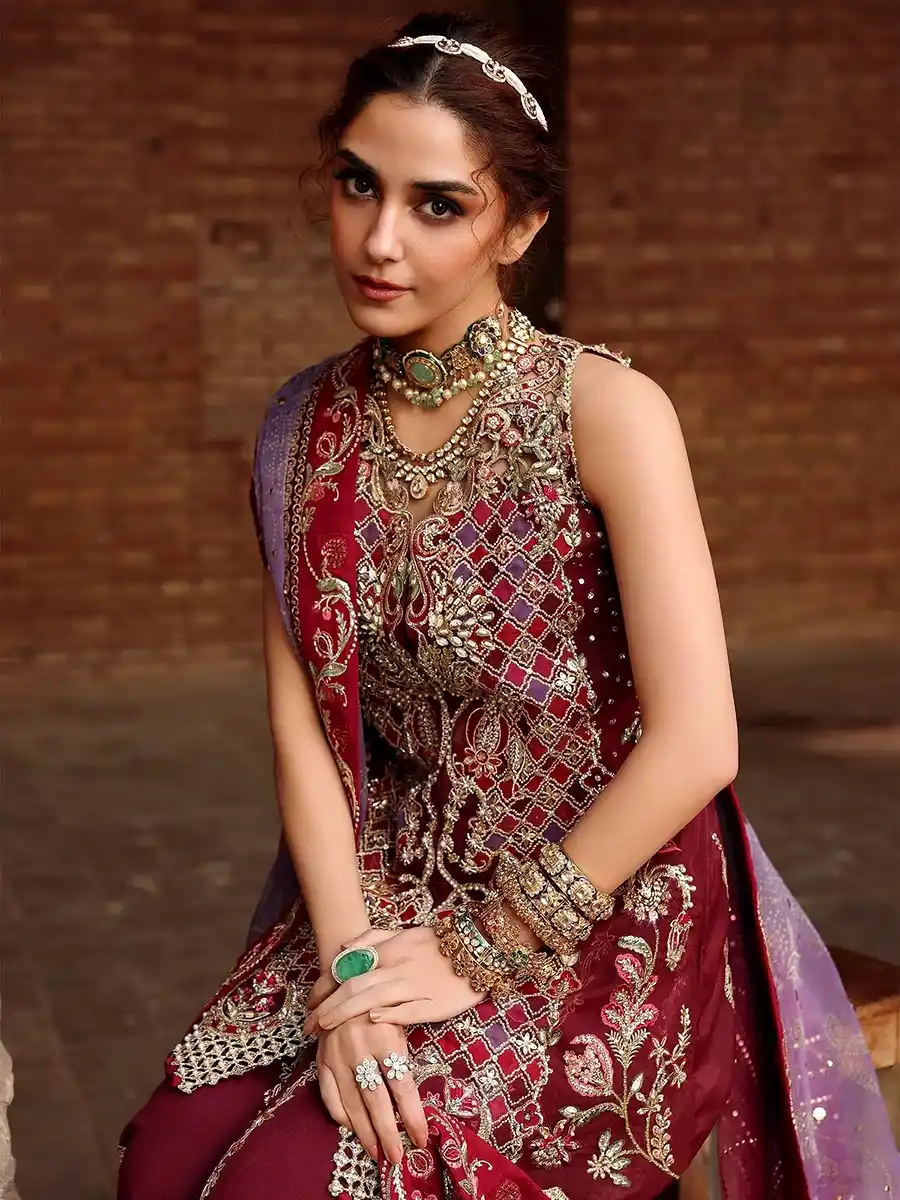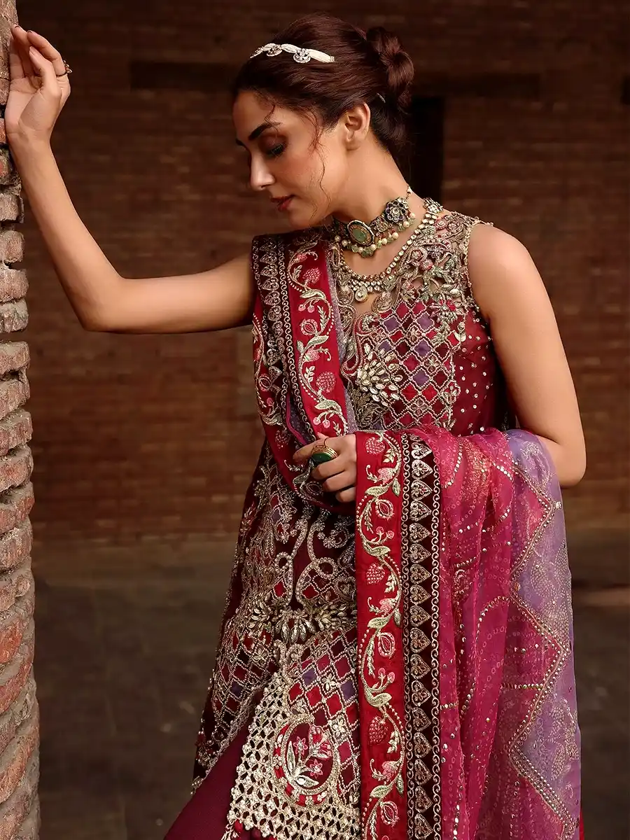 Dupatta ke liye 5.3M sequinned embroidered patti, 2M sequinned & embroidered pallu on velvet, aur 8M four-side sequinned embroidered patti on silk.