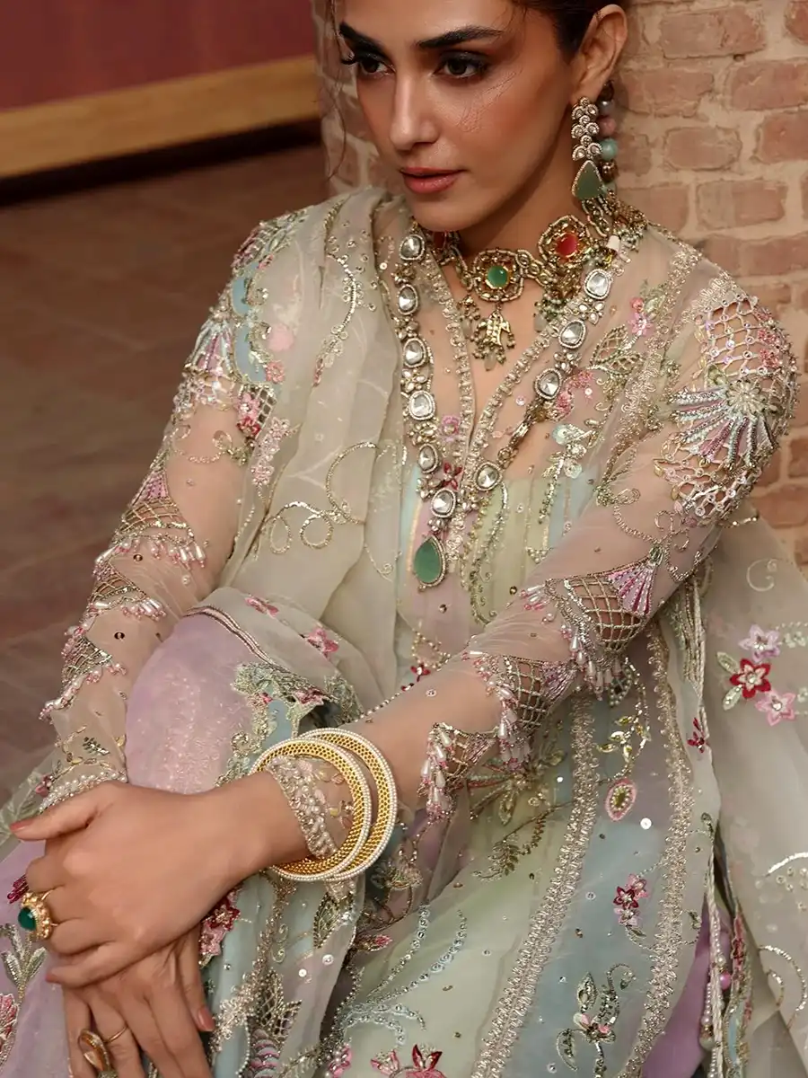 Dupatta: 2M sequinned, embroidered, and foil-appliquéd with 1 pair colour-blocked pallu.